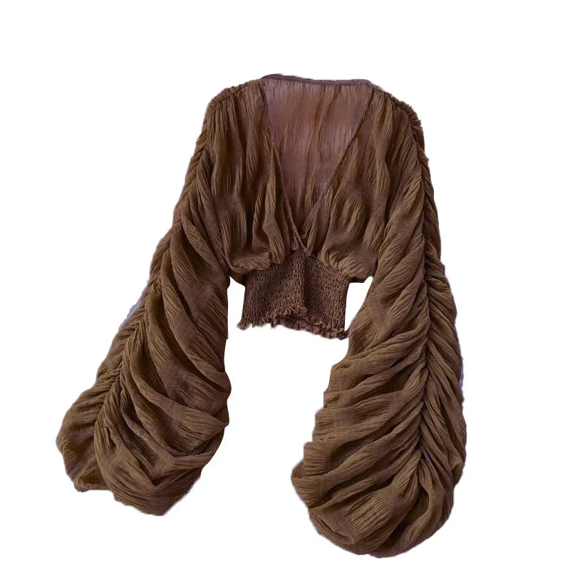 Summer Sexy Draped Chiffon Blouse For Women Elegant V-Neck Puff Long Sleeve Short Tops Female Slim Party Shirts 2022 New Fashion