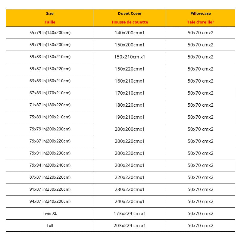 ●Twin/Twin XL:Duvet Cover 173*229cmx1 pc,Pillowcases 50*70cmx2pcs;