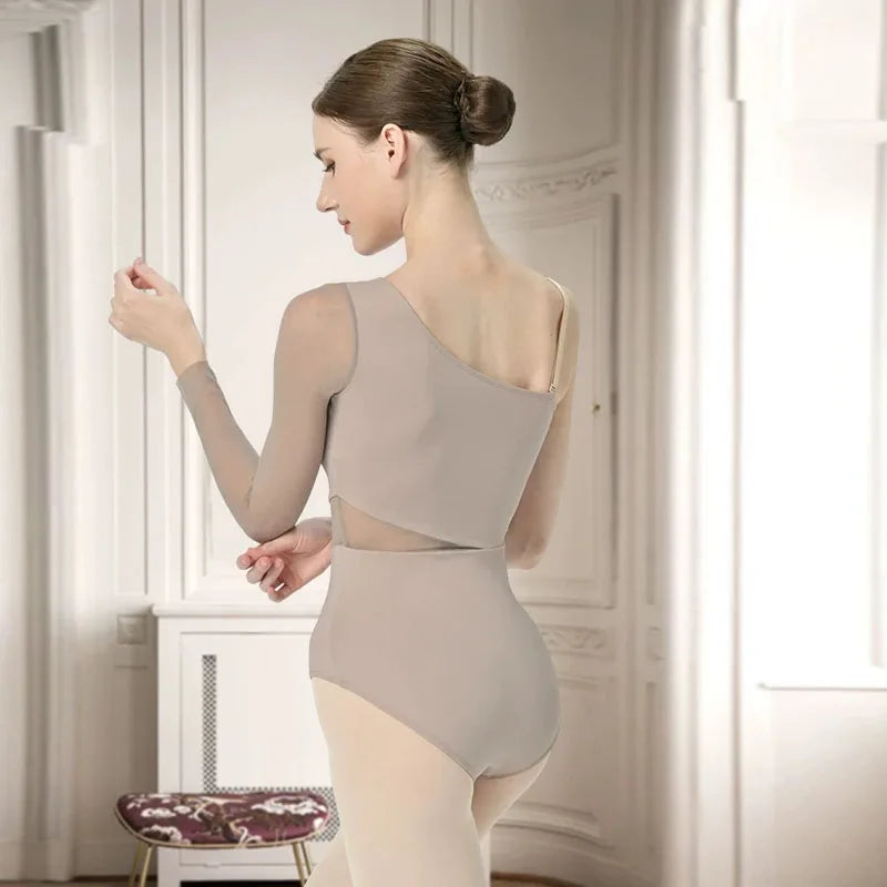 New Ballet Dance Leotards for Girls Women Mesh Splicing Diagonal sleeved irregular Long Sleeves Gymnastics Lyrical Stage Costum
